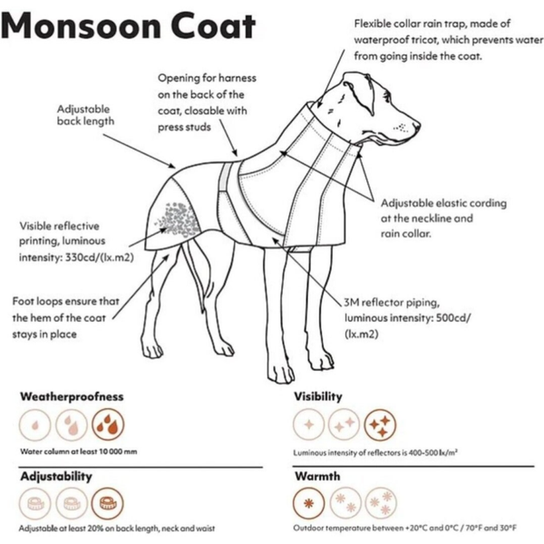 Hurtta monsoon coat De prachtige regenjassen van hurtta zijn perfect voor de natte regenachtige dagen. Ze hebben een flexibele kol, die gemaakt is van waterproof tricot, dit voorkomt dat er water naar binnen loopt via de hals. De Hurtta monsoon regenjassen zijn minimaal 20% verstelbaar op de rug, nek en taille en sluiten dus super mooi aan op uw hond. Doordat de Hurtta regenjas zo mooi aansluit wordt de bewegingsvrijheid van uw hond niet belemmerd.