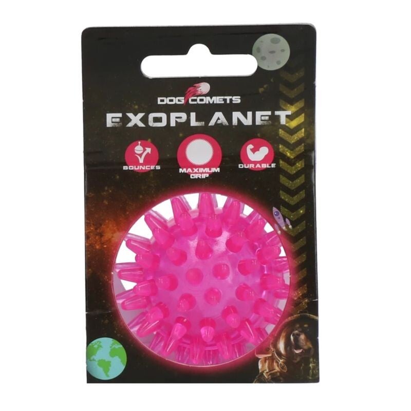Deze bal vol met stevige maar flexibele 'stekels' zorgt voor urenlang speelplezier en helpt tegelijkertijd het gebit te reinigen! De Dog Comets Exoplanet stuitert perfect, drijft op water en is dankzij de stekels makkelijk vast te pakken. Deze eigenschappen zorgen ervoor dat de bal erg geschikt is voor het apporteren en om mee te spelen in het water. Als de hond de bal in de bek vastpakt, dan masseren de stekels het tandvlees en ze helpen de tanden te reinigen. De pieper in het midden zorgt voor extra stimulans tijdens het spelen.